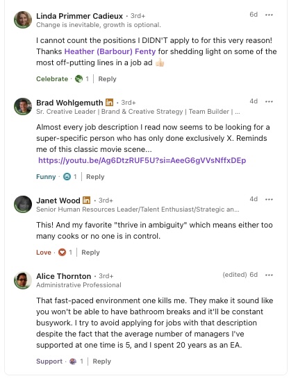 - Linda Primmer Cadieux (Personal Growth Coach): “I cannot count the positions I DIDN’T apply to for this very reason! Thanks Heather (Barbour) Fenty for shedding light on some of the most off-putting lines in a job ad 👍🏻”