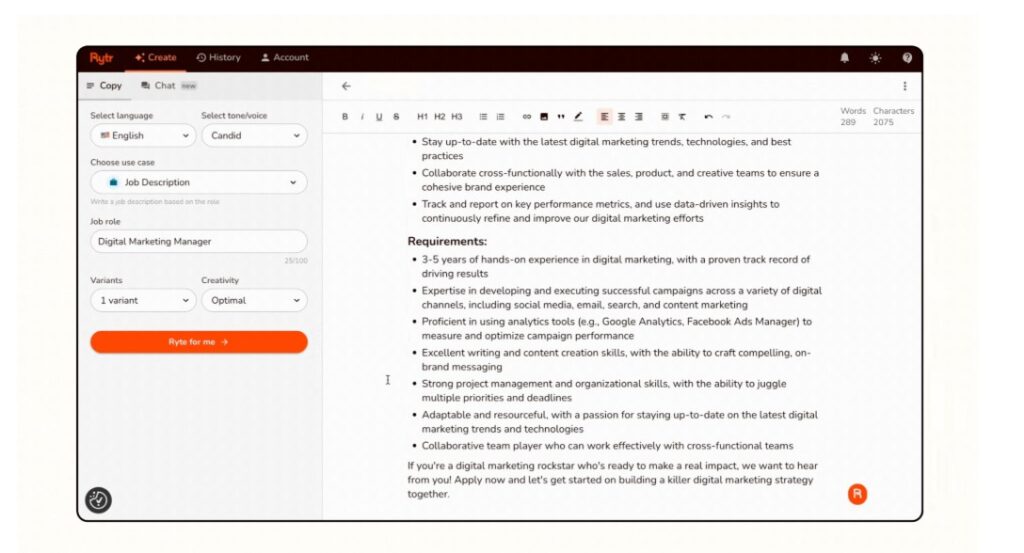 Rytr is a smart tool that also uses AI (Artificial Intelligence) to assist you in creating job descriptions. It’s like having a helpful assistant that understands your needs. So, with Rytr, you have the freedom to personalize the job description according to your preferences. You can choose the way it sounds, the writing style, and also the specific details you want to include. With this, you can make sure that the job description perfectly fits what you’re looking for. Thus, it makes the hiring process much easier and tailored to your unique needs.