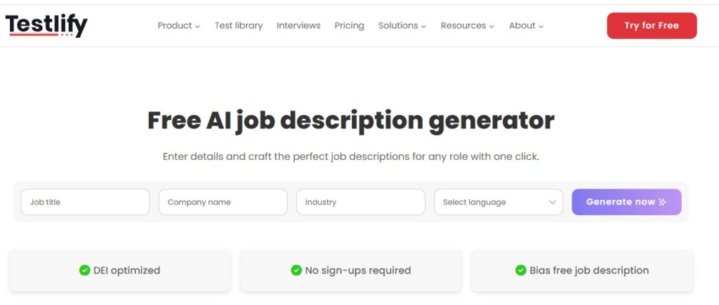Testlify’s AI-generated job descriptions are DEI-optimized and bias-free. No sign-ups are required to use this free tool.  Just enter job title, company name, industry, select language, then click ‘Generate now’ and receive your JD.